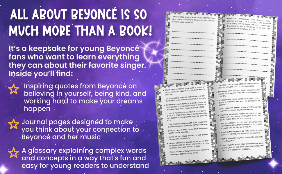 Filled with surprising facts, incredible stories about work ethic, and interactive journal pages, ALL ABOUT BEYONCÉ is so much more than a book — it’s a keepsake for young Beyoncé fans who want to learn everything they can about their favorite singer. It is designed to motivate young kids (ages 8-12) to become the most amazing version of themselves.